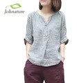 Johnature Women Shirts Bat Sleeve Loose Casual Blouses 2017 Summer New Linen Tops V-Neck Button Brief One Size Vintage Shirts USD 28.90/piece